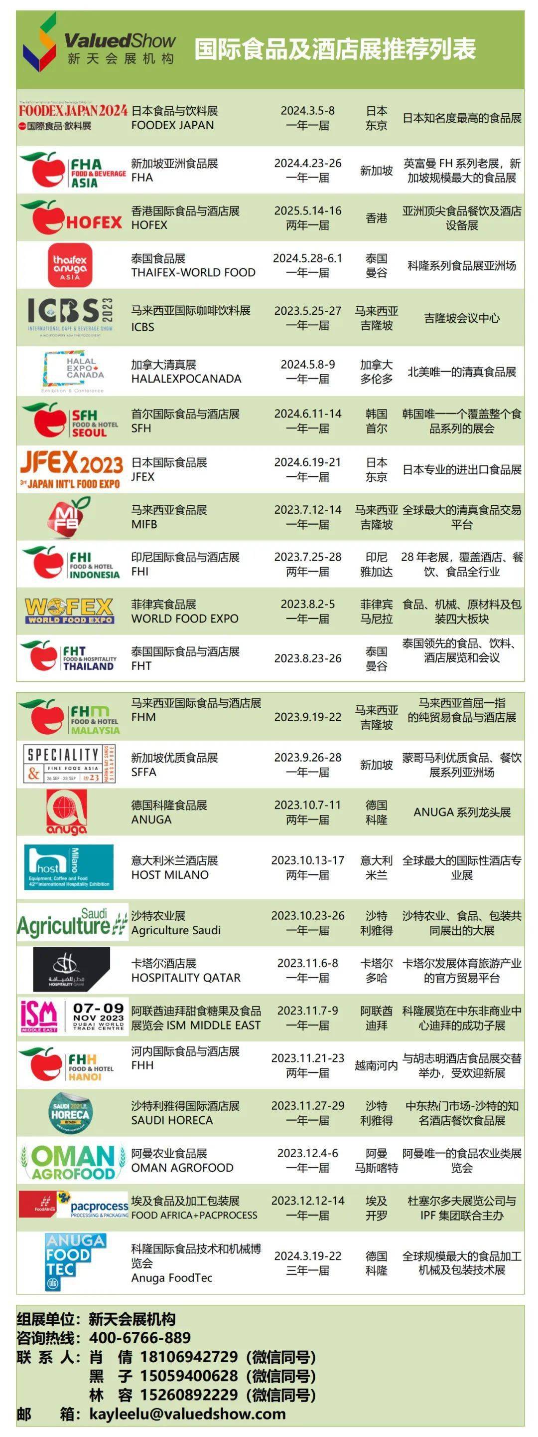 2023泰國(guó)亞洲國(guó)際食品展 THAIFEX 火熱開(kāi)幕! 2024德國(guó)國(guó)際果蔬展覽會(huì)展位正在接受預(yù)定 2023 年香港國(guó)際食品與酒店展火熱舉辦! 2023年西班牙巴塞羅那水產(chǎn)展圓滿(mǎn)舉辦